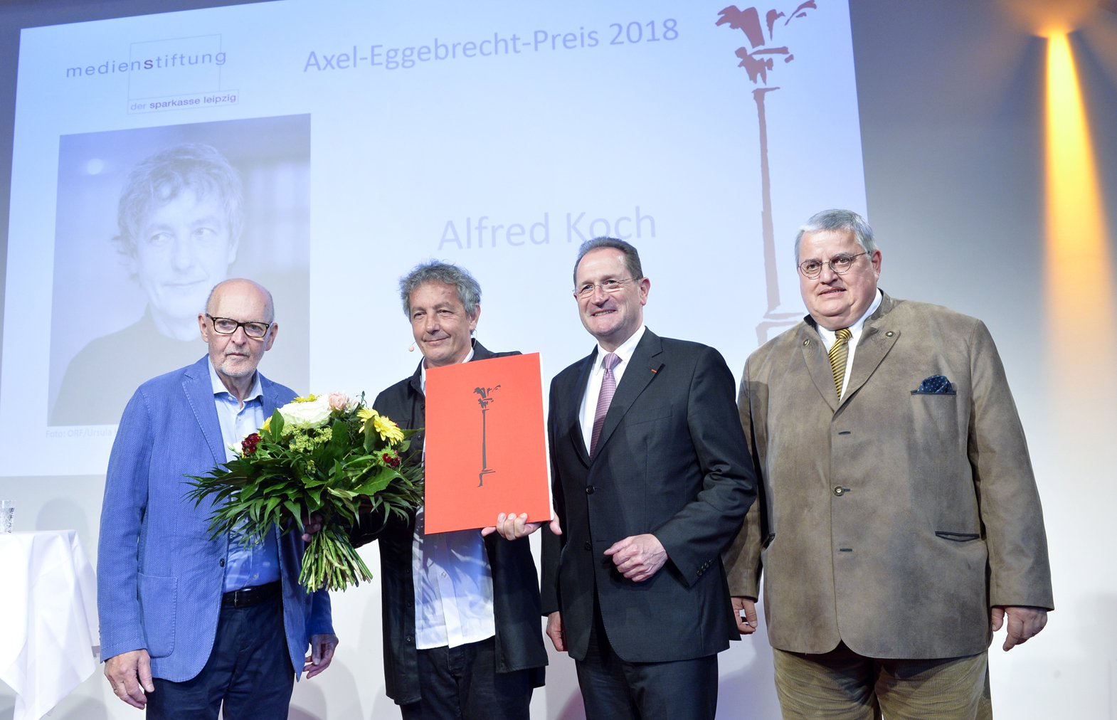 v.l.n.r.: Richard Goll (Juryvorsitzender), Preisträger Alfred Koch, Dr. Harald Langenfeld (Vorstandsvorsitzender der Medienstiftung und der Sparkasse Leipzig) und Stephan Seeger (Geschäftsführender Stiftungsvorstand)
