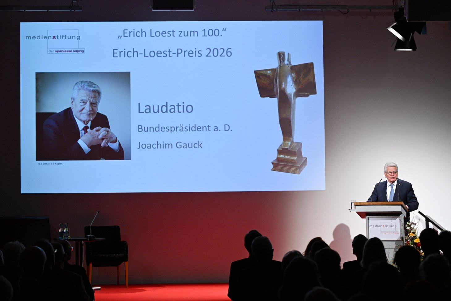 Leipzig, der 24. Februar 2026. Anlässlich des 100. Geburtstages von Erich Loest hat die Medienstiftung der Sparkasse Leipzig am 24. Februar 2026 den Erich-Loest-Preis 2026 an den Schriftsteller und Georg-Büchner-Preisträger Durs Grünbein verliehen. Der von der Medienstiftung der Sparkasse Leipzig im Andenken an den am 12. September 2013 verstorbenen Leipziger Schriftsteller und Ehrenbürger Erich Loest ins Leben gerufene Preis ist mit 10.000 Euro dotiert und wird zum sechsten Mal verliehen. Die Laudatio auf Durs Grünbein hielt Bundespräsident a. D. Joachim Gauck.