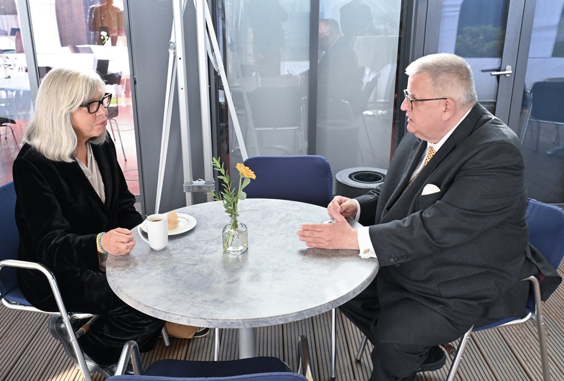 Rebecca Harms (früheres Mitglied des Europäischen Parlaments und Stellvertretende Vorstandsvorsitzende des Europäischen Zentrums für Presse- und Medienfreiheit ECPMF) im Gespräch mit Stiftungsdirektor Stephan Seeger (ebenfalls Mitglied des Vorstandes des ECPMF).